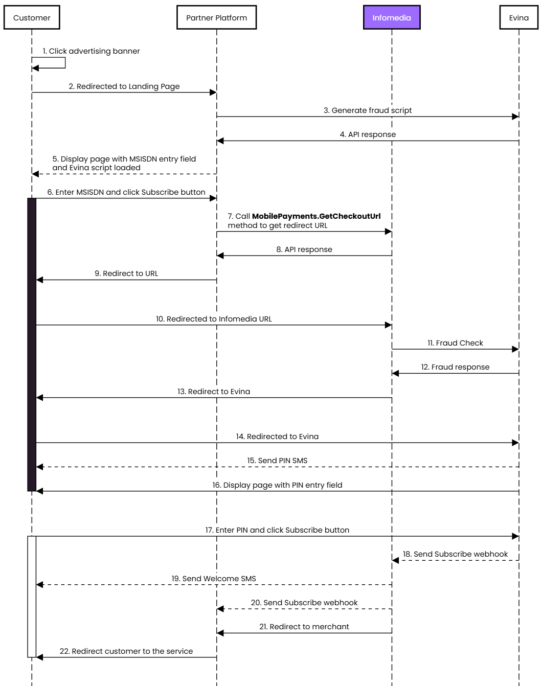 POST https://api.infomedia.co.uk/dcb/GetCheckoutUrlContent-Type: application/jsonX-Infomedia-Api-Key: {Your API Key}{"params": [{"key": "pid","value": "92000000"},{"key": "subid","value": "8000000"},{"key": "mx","value": "971500000000"},{"key": "mcc","value": "424"},{